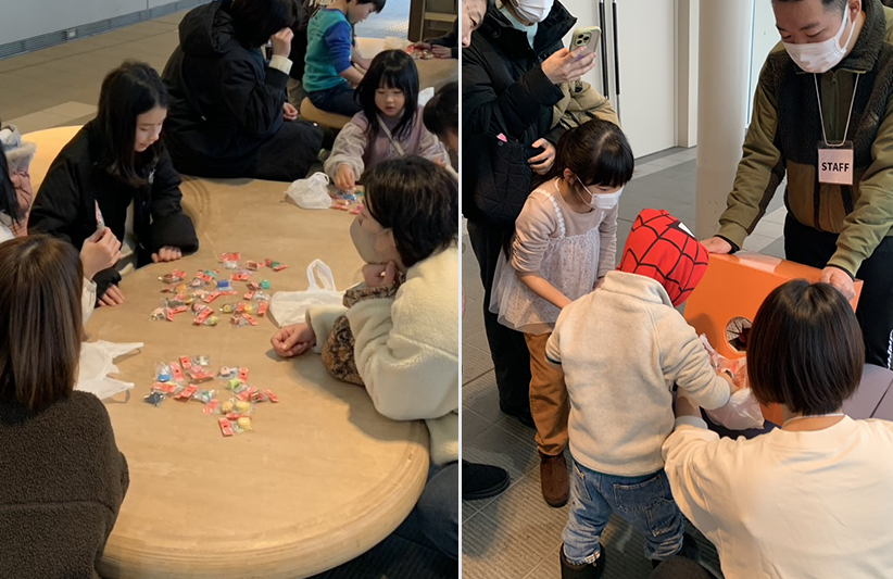 「いくつ取れるかな?」と、小さな手いっぱいに消しゴムを掴もうと奮闘する幼児や、「何が取れた?」「交換しよう」と言い合っているお姉さんたちの姿が印象的でした。